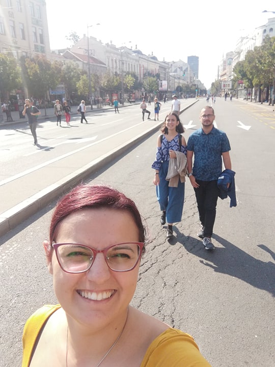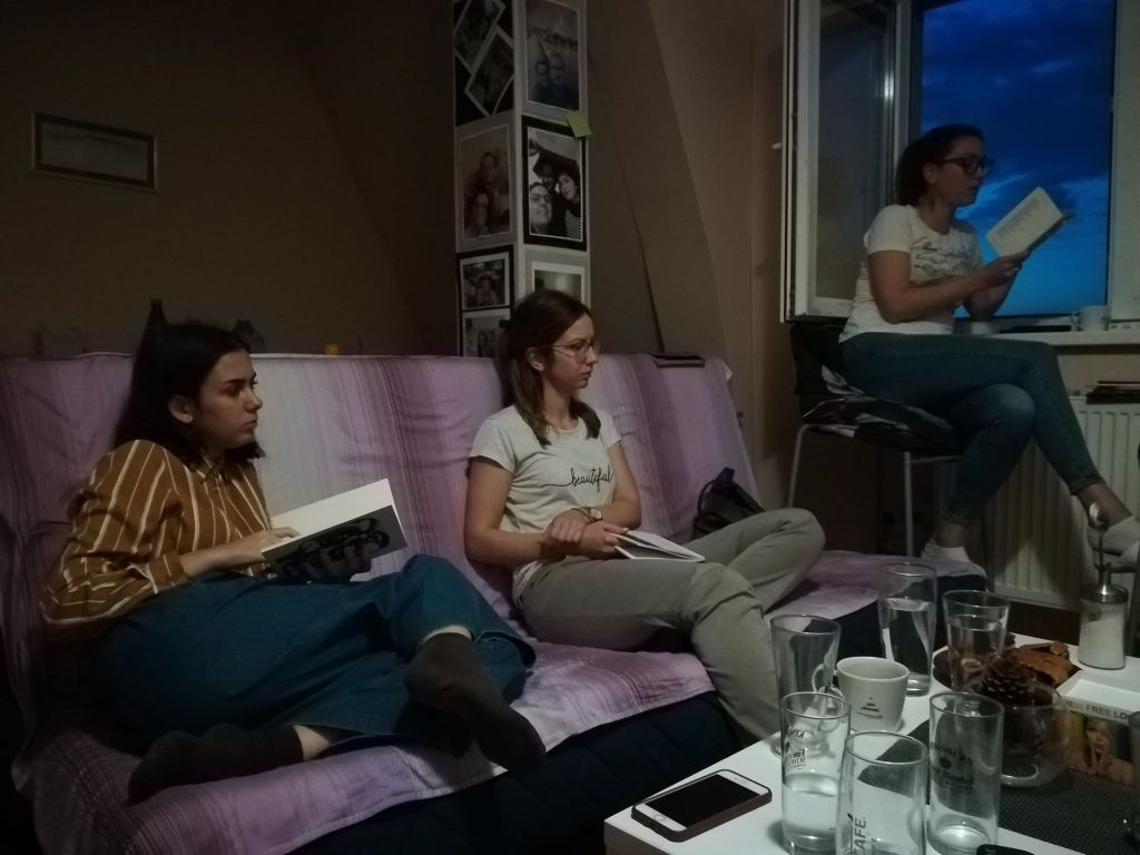 28. septembra 2019, dakle, poslednje subote u mesecu, mesečarili smo u okrilju NINODRAGA, i to u sastavu mlade spisateljice Anđelije Dejić (Užice), Vauarsovki i mladih pesnikinja: Antonele Mik (Pančevo), Marice Ćosić (Kovin) i Dunje Radovanović (Vršac). U nasumično odabranim različitim poetskim knjigama savremenih pesnika, na istoj stranici, iščitavali smo stihove, učitavali se u njih i dočitavali svoje utiske i predloge, pod neposrednim diktatom prvojavljenog osećaja. Govorili smo i vlastite stihove u okviru NINODRAGOVE audio emisije, i međusobno ih komentarisali. Pričali smo o onome najgorem što smo napisali i emocijama koje ponovljeno čitanje toga izaziva u nama. Kreativno smo se zaigrali nad pojmom „kokica“, pokušavajući da ga uvedemo u polje inspiracije, te od njega stvorimo stih, slogan, pesmu ili početak priče. Nominovali smo goste sledećeg Ninodraga. Sutradan smo uživali u nadstvarim umetničkim slikama akademika Ljube Popovića, izloženih u galeriji SANU.
