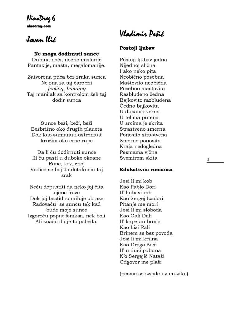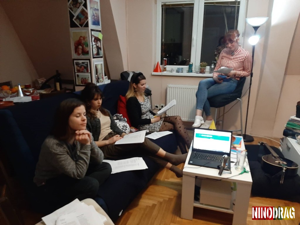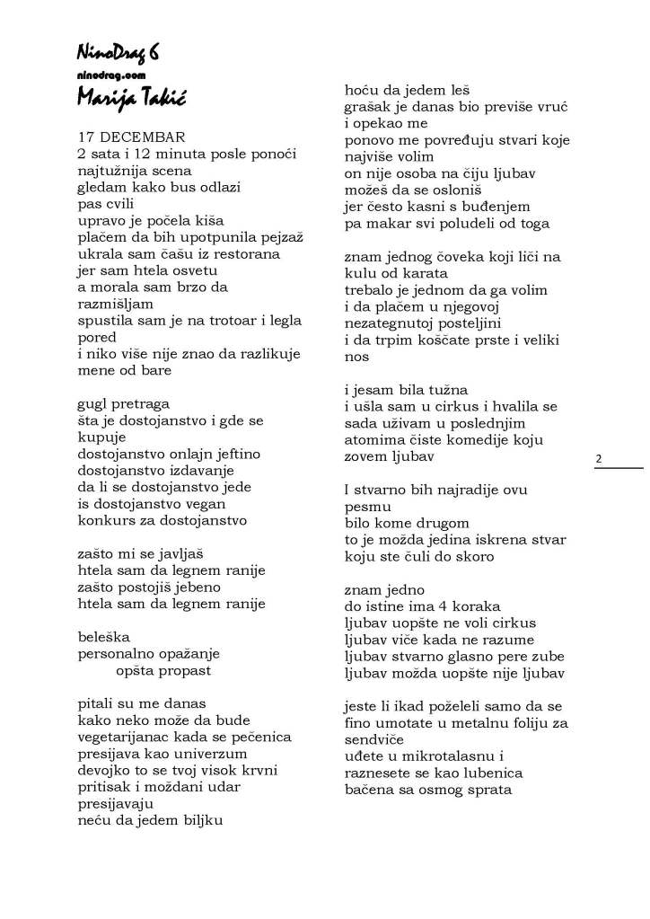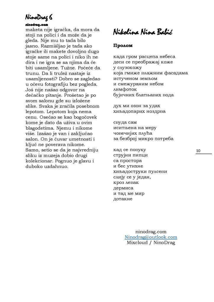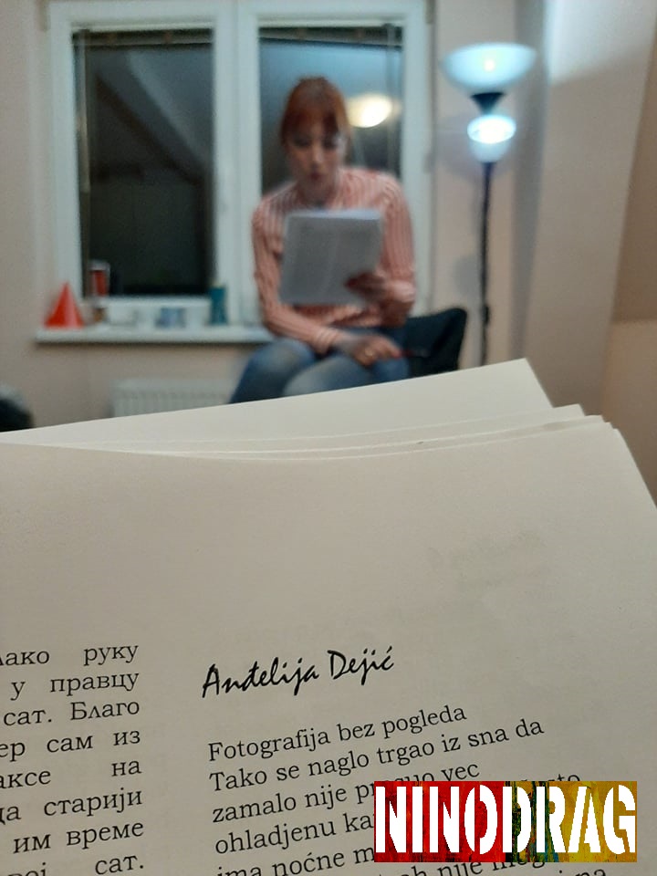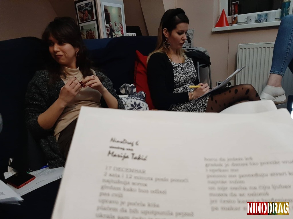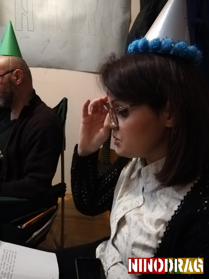 NinoDragom je ovoga puta šestarila Anđela Pendić (Beograd), autor dve nagrađene zbirke pesama, „Beleg“ (2015) i „Oganj“ (2016), doktorand na smeru Opšta lingvistika Filološkog fakulteta – zapravo, ona koja je uspela da u sebi pronađe to mesto odakle se čovek preobražava u stvaraoca i umešno ga iz sebe prenese u reči sa svom smislenom dubinom. Prilikom njenog predlaganja za nominaciju, Šimon Subota je rekao „Apsolutno genijalna pesnikinja i osoba, ima dve zbirke za sobom, studirala je ruski i ima neverovatan njuh za dobru muziku i film“. Pored Anđele, ugostili smo Bojanu Kostadinović (Užice), kostimografa i modnog dizajnera. Odabir tkanine za kostime je njen način umetničkog izražavanja i ispoljavanja u različitim vremenima, istorijskim, intimnim ili izmaštanim. Podelila je sa nama nedavno iskustvo kostimografa predstave „Sirano“, odigrane u Kosovskoj Mitrovici. Svoje umeće je nadograđivala u Italiji. Među gostima se pronašao i jedan kreativno svestrani građevinski inženjer – Vladimir Pešić (Raška). Tekstopisac, kompozitor i kantautor, te ne čudi što su njegovi stihovi srasli uz muziku koju stvara preobražavajući zvuke neobičnih instrumenata poput vove, okarine, usne harmonike, bazukija itd…. Autor je tri zbirke pesama („Heksagram 65“, „Vilenjak istočnog vetra“, „Kodeks kapetana Strongvila“) i jedne zbirke priča („Čaršijske priče“). S nama je još jednom bila sjajna mlada pesnikinja Marija Takić, pobednica prve pesničko – scenske manifestacije „Grungebook“ i drugoplasirana na poetskoj manifestaciji „Timočka lira“, koja je, pre nego što će doći, na pozivnicu odgovorila: „Hoću, baš mi je jedan NinoDrag potreban ovih dana“. Marija je sa nama podelila pesmu mladog pesnika u začetku – Jovana Ilića, obavezama sprečenog da prisustvuje. Kao važna konstanta NinoDraga, prisutna je bila i Anđelija Dejić (Užice), čija je proza preobražavajuće specifična – upravo poput skoka s starog železničkog mosta u Đetinju.