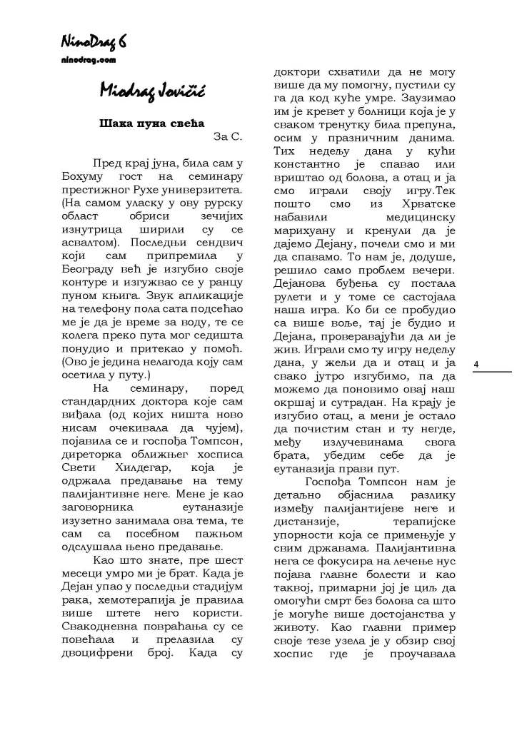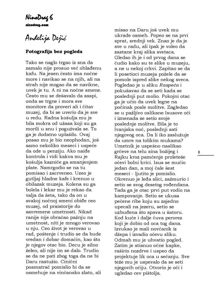 Šesti NinoDrag dogodio se februarovog prvog dana, i beše to prvi u tekućoj godini. Zima se prerano preobrazila u proleće (ako li je zime uopšte i bilo), a mi smo, zajedno s našim tovečernjim Ninodragcima pokušali da izađemo iz izazova „Šest šešira“ kao stvaralačka celina, ne bi li se preobrazili kao šestica u devetku i odvojili se od svog dela, uspravljene glave, gladeći bradu, iz perspektive Tvorca.