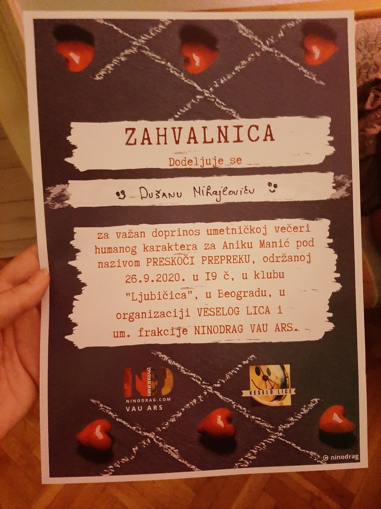 Desio se taj 26. septembar 2020, u klubu LJUBIČICA, na Dorćolu u Beogradu, i u njemu humanitarno umetničko veče PRESKOČI PREPREKU za Aniku Manić, devojčicu obolelu od spinalne muskularne atrofije, ili skraćeno SMA, tip 1, za čije lečenje terapijom Zolgensma je potrebno izdvojiti neverovatnih 2,1 milion evra. S obzirom da je novac neophodno sakupiti što pre, drugu sezonu NinoDrag Zajedničarenja odlučili smo da započnemo na posve drugačiji način – najpre, potvrdnim odgovorom Slađani Bušić i njenom VESELO LICU i ideji da se ovo veče organizuje i ponese naziv PRESKOČI PREPREKU – i tako postasmo suorganizatori.