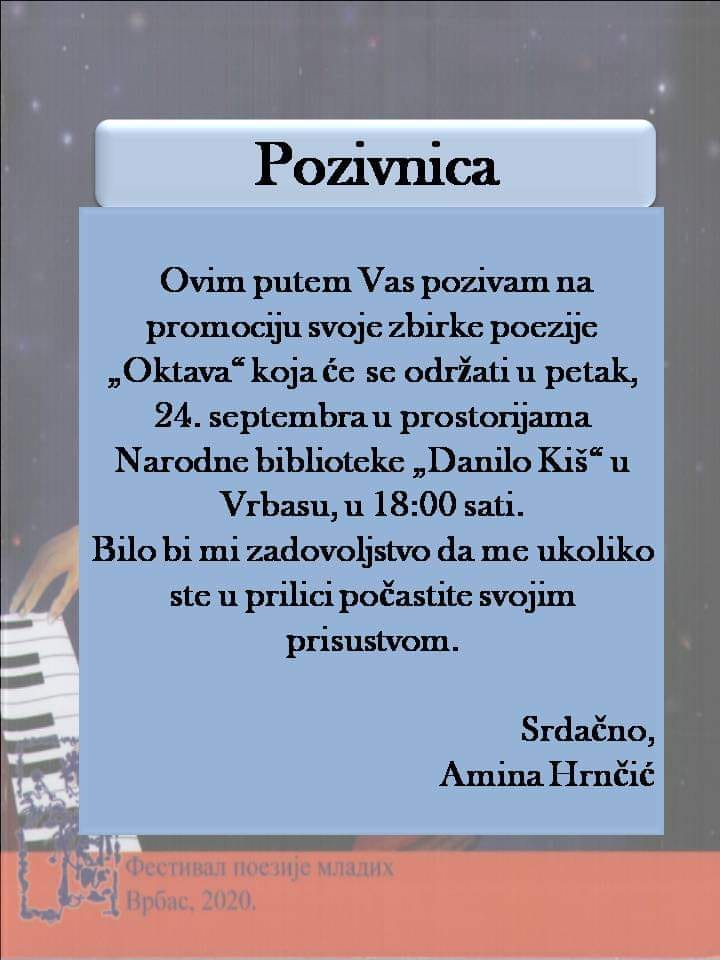 Izbor iz poetske zbirke „Oktave“, autorke Amine Hrnčić, objavljene 2020. godine, u okviru Festivala poezije mladih, čiji je laureat Amina bila. Promocija zbirke najavljena je za 18 časova, 24. septembra 2021, u prostorijama biblioteke „Danilo Kiš“ u Vrbasu. Dobrodošli!
