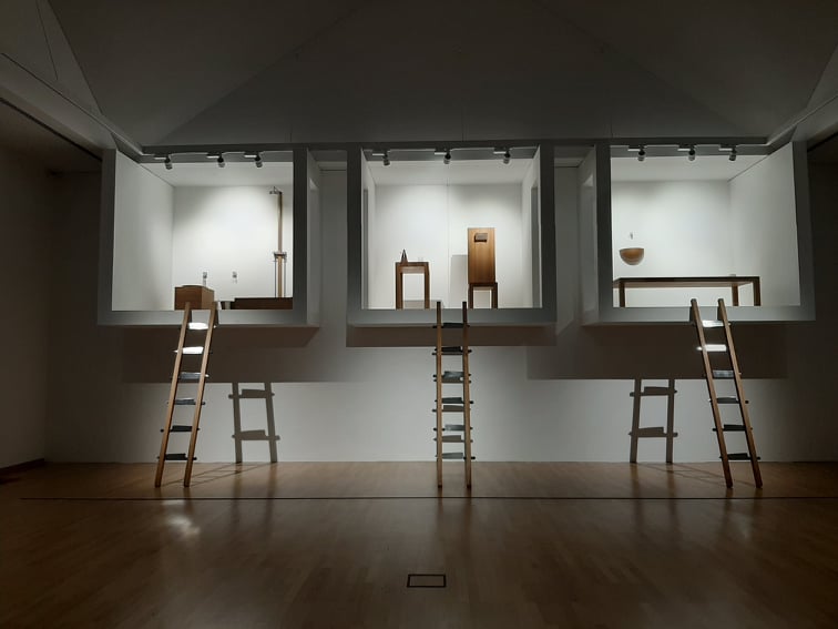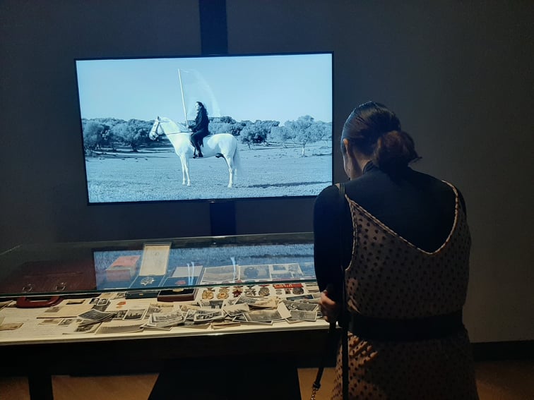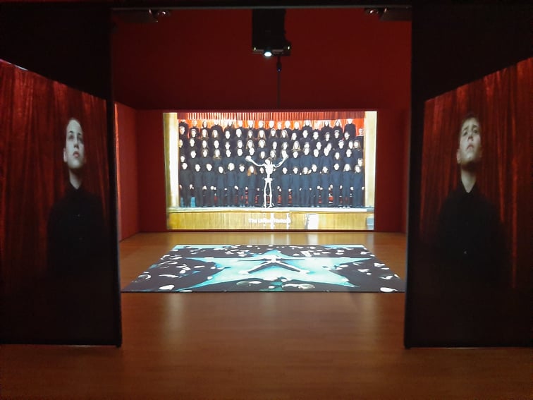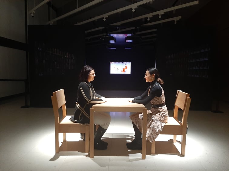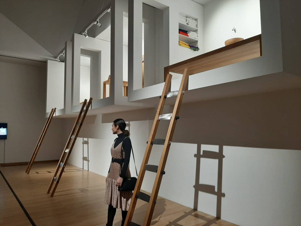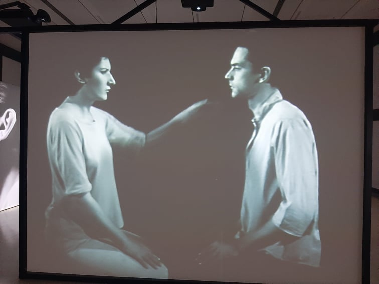 Stoga se na ulazu (ali i izlazu), u povlašćenom položaju, nalazi prikaz performansa „Umetnik je prisutan“ (2010, Njujork), jedan od najtežih koje je ikada izvela, po njenom ličnom svedočenju. Naizgled jednostavan (po pitanju forme: geometrije, arhitekture, boja, elemenata i sižea), podrazumevao je statičan, gotovo nepomičan sedeći položaj Marine koja je uspostavljala kontakt očima sa 1675 posetilaca. Sa sve tri strane izložbene kućice stajali su veliki monitori, simulirajući sve tri perspektive: Marininu, posetiočevu i posmatračevu. Ljudska lica su se menjala po diktatu facijalnih ekspresija, čas bivala ozbiljna, kamena, čas nasmejana, ali fokusirana, s neprekinutim kontaktom očima. Po ovim fizičkim menama vidi se da je to bio intenzivan zaumni dijalog dva bića, u kom je dolazilo do ogromne energetske razmene. Rezultat toga bilo je stanje neopisive mentalne i fizičke iscrpljenosti. Dunja i ja smo se svega nekoliko sekundi gledale u oči, a zatim stolice prepustile majci i kćerki koje su nas fotografisale. Kćerka je u polu šali rekla da će veliki izazov za nju biti majku dugo gledati u oči. Činjenica je da sve manje jedni druge gledamo u oči, posebno ako se ne poznajemo, jer isuviše sebe prepuštamo drugom kroz dužicu oka. No, osnovna zamerka je što umetnik, ipak, nije bio fizički prisutan – to nije moglo popraviti ni tehničko savršenstvo izložbe. Ono što je naročito bilo zanimljivo je „Privatna arheologija“, odnosno zbirka njenih razmišljanja o izvorima sopstvenog dela (artefakti, odlomci iz knjiga, fotografije performansa drugih umetnika, utiske sa putovanja, portreti ljudi i mesta) u vidu 59 anotiranih kolaža, tematski raspoređenih („Mesta noći“, „Hrana“, „Priprema za Stupanje na drugu stranu“, „Smrt“, „Stupanje na drugu stranu“) – raspoređenih u tri kredenca od bele hrastovine, fioke sa crtežima u kombinovanoj tehnici. Spoljašnja geografija drevnih naroda ucrtavala je mapu uticaja u njenu psihu (Amazonska plemena, plemena iz Papa Nove Gvineje, Aboridžini, tajlandski i grčki monasi, drugi savremeni performatori…).