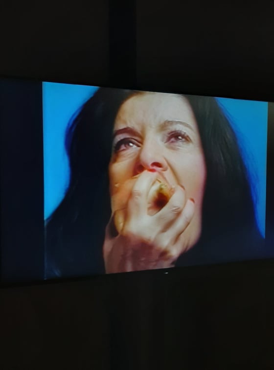 Posebno su me dirnuli performansi sa Marininim autobiografskim momentima, poput „Luka“ (1995) gde tematizuje stvaralački umor. Jede veliku glavicu crnog luka s opnom, očiju uprtih k nebu. Crveni karmin se razmazuje pod naletom lakrimalnog faktora luka i suza; facijalna ekspresija simulira patnju, inače, po njenim navodima, kreativno stanje umetnika. Stanje koje porađa ideju, ideja pak – realizaciju. U pozadini teče narativ: