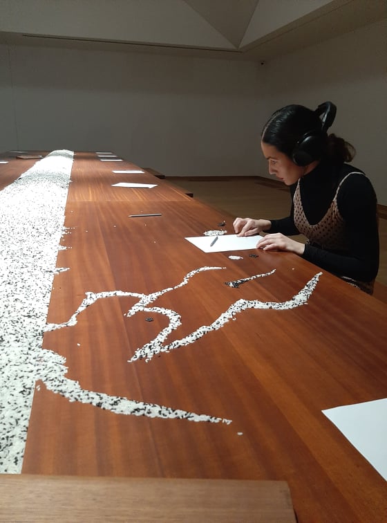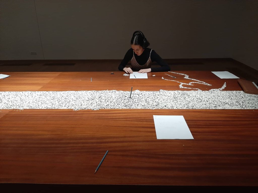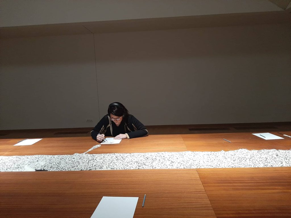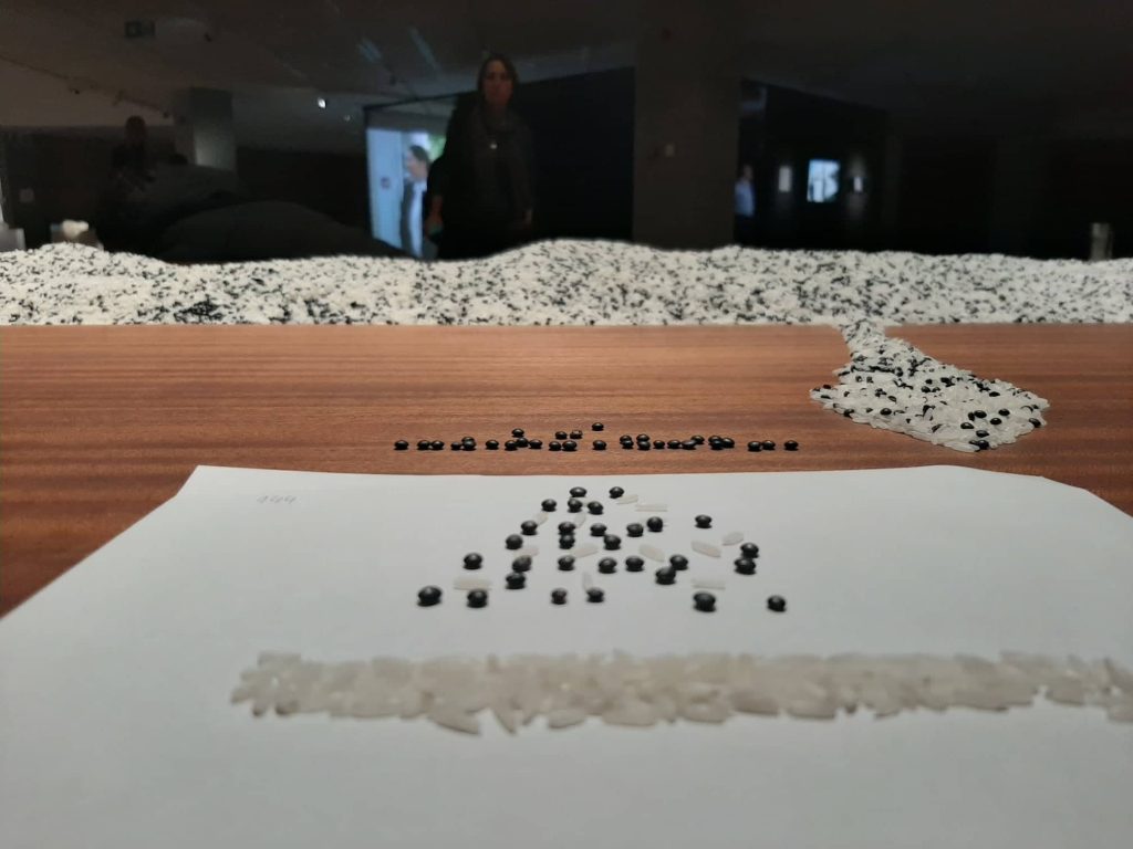 Sve lične stvari zaključavale su se u ormariću, u neposrednoj blizini. Za dugačkim drvenim stolom, koji je podsećao na slavski sto, gde je umesto posluženja, u centralnom udubljenju stajalo zrnevlje pirinča i tamnog sočiva. Na stolu je stajao beli papir i drvena olovka, na ušima slušalice koje su prigušivale iritantnu zvučnu mešavinu iz ostalih performansa. Trebalo je brojati zrnevlje. I zaista, prvo sam počela da brojim zrno po zrno, a zatim sam se zapitala o smislu toga što radim. Poenta nije bila u pukom brojanju zrnevlja – ne bi bilo smisla (kao što ga ne bi bilo ni da smo u svakom momentu svog postojanja svesni otkucavanja kazaljki – odnosno svoje prolaznosti. Prolazni smo, pa šta?!). Zatim sam krenula da pravim apstraktna piramidalna tela od zrnevlja, potpuno udubljena u posao – osećaj toplote oko dijafragme mi je bio dobar pokazatelj da sam zadatak ispravno shvatila. Prekidala sam jedino da fotografišem rad. Potrebno je, dakle, to vreme između odbrojavanja ispuniti nečim svrsishodnim – stvaranjem. Zagledana u tu prostu tvorevinu shvatila sam da se dato zrnevlje transformisalo iz vremenske jedinice u sredstvo za kreaciju, u objekat više stvarnosti. Pogledala sam oko sebe i primetila da su i ostali ljudi radili isto – stvarali nešto po diktatu svog kreativnog bića, aktiviranog u dimenziji psihe lišene prostornog i vremenskog određenja. Izgleda da je međusobna metapsihološka veza uspostavljena. Da li je to ista dimenzija u čijem okrilju komuniciraju stvaraoci i njihova dela međusobno? Sve je moguće, ako se u to veruje.